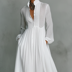 Un vestido largo minimalista con un encanto natural. Confeccionado en una suave mezcla de algodón y lino, ofrece una silueta fluida, realzada por un cuello subido estructurado y sutiles detalles de patchwork. Una pieza atemporal, cómoda y fácil de llevar, pensada para un estilo elegante sin esfuerzo.