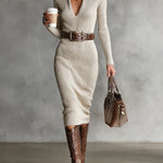 El vestido Clara combina el confort del punto con la elegancia de una silueta entallada. Su diseño de cuello medio alto con escote en V crea una línea refinada y moderna, mientras que el cinturón resalta la figura con un toque estructurado y sofisticado.